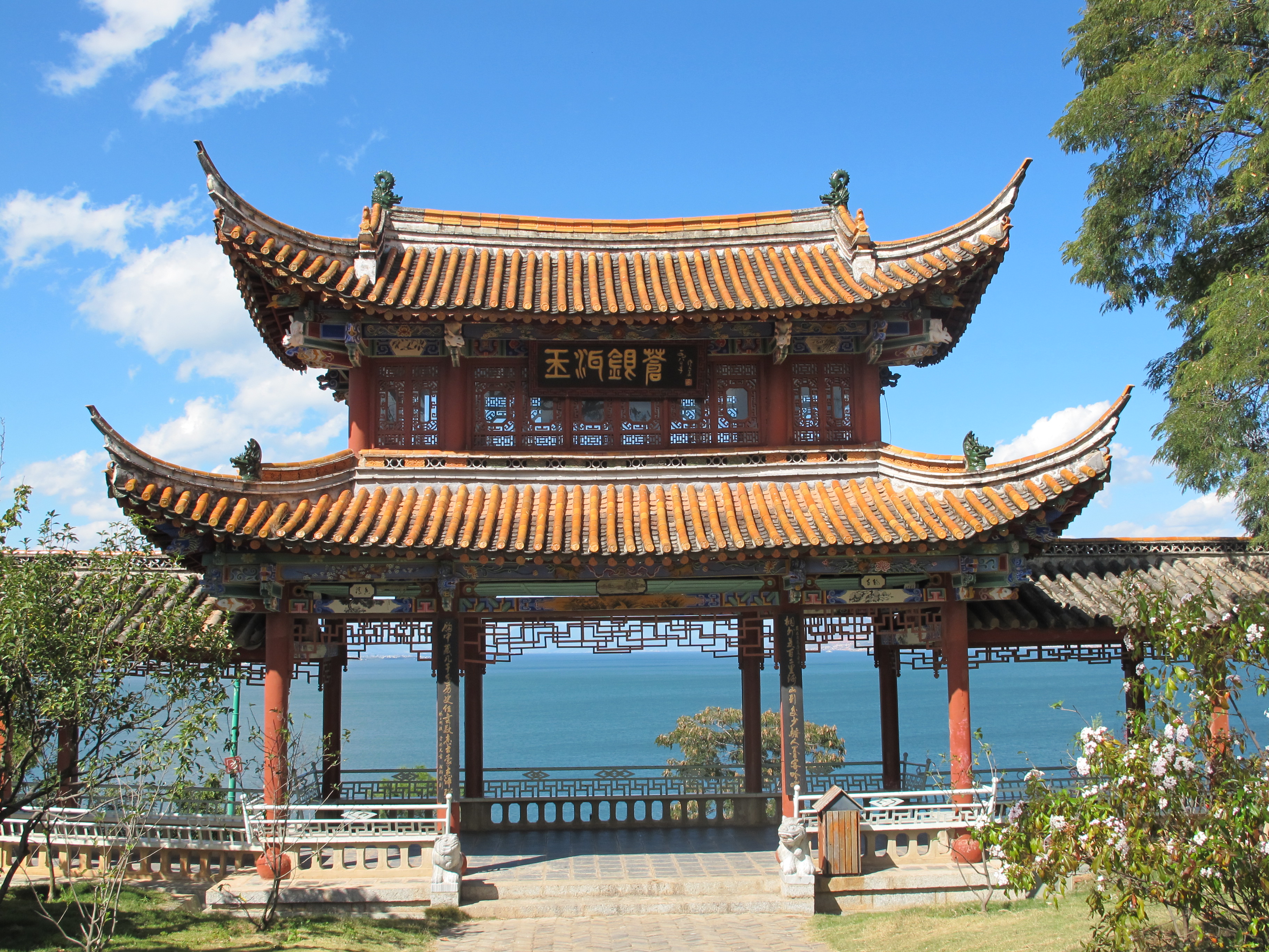 We started our adventure in Dali at a really tasty restaurant (Shui Shang Ren Jia) near the Dali Prefecture Museum on the edge of Erhai Lake. All the kids upped their vegetable consumption quotient on this trip in spades. Next we went to Erhai Park. We climbed 287 steps (how do you think we got the kids to the top?) to a beautifully manicured scenic park perched above the lake and surrounded by mountains. From that vantage point, Dali New Town looked just like Queenstown. The kids got their first Mandarin test as we looked at the gate and they had to name the animals and colors. Elena had trained as a teacher before she changed professions to tour guide, so we hit the jackpot in finding her.