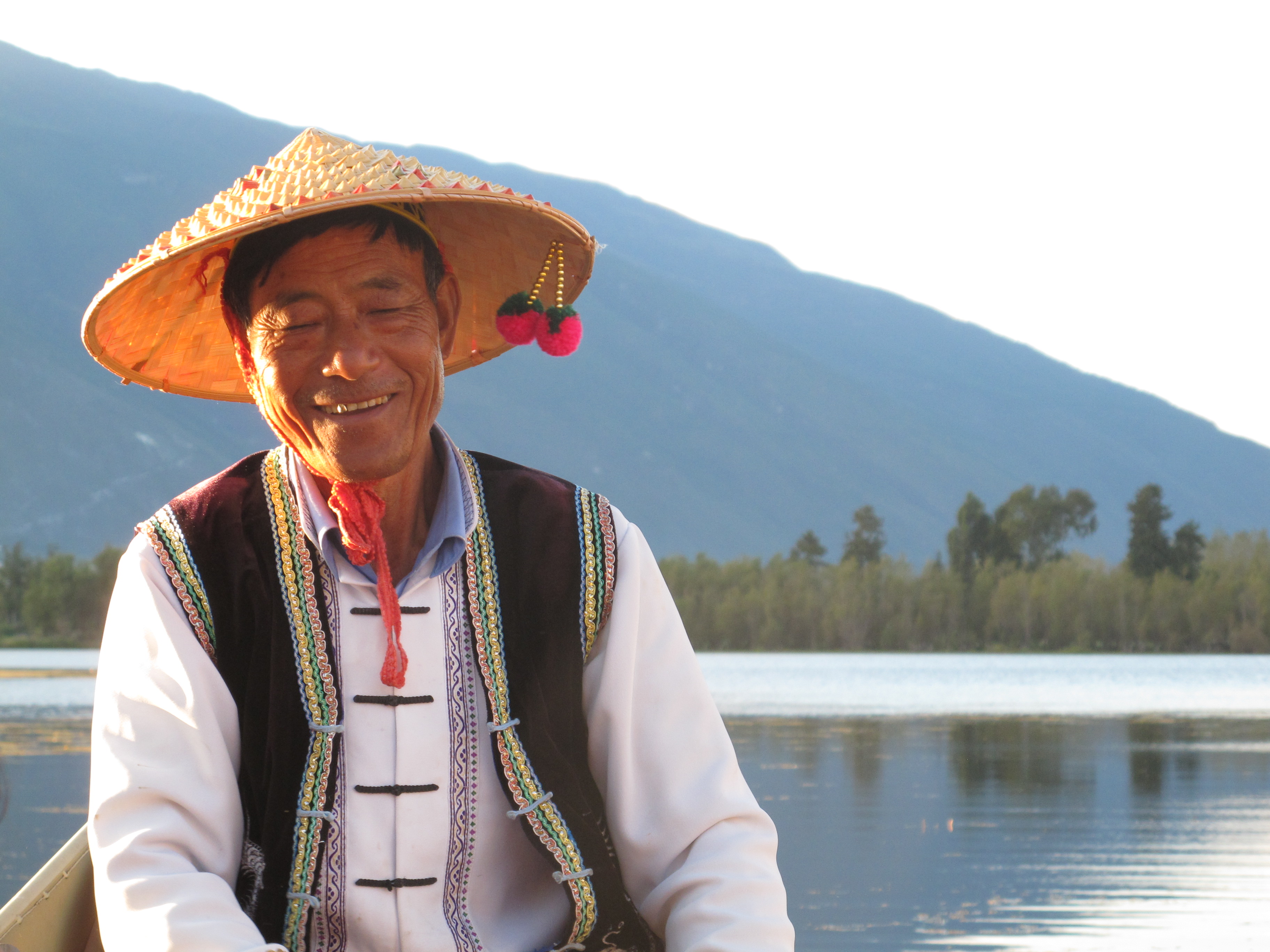 On our way from Dali to Xizhou where we would spend the night, we made a stop at the lake where we did our most touristy thing of the whole trip. We didn’t really realize what we had signed up for and I think I would skip this if I go back, but it was beautiful to be out on the lake and certainly a memorable experience. We were suited up with bright orange life jackets and sent out on a long skinny boat rowed by a graceful old man in a cone shaped hat.