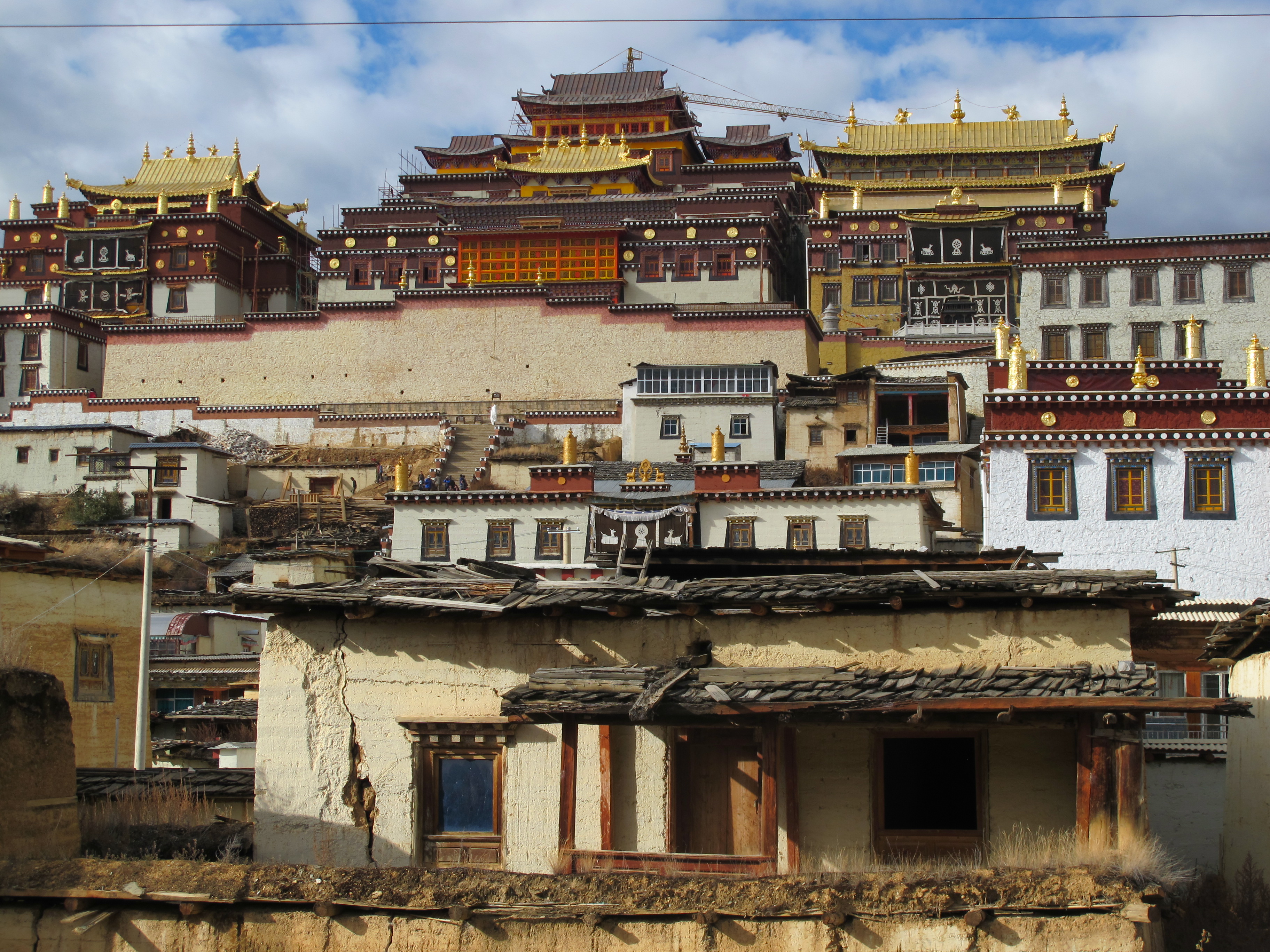 As we drove along the windy road to Shangri-La the terrain got fiercer, drier and the architecture changed. We were entering Tibetan territory. The houses are enormous, made of mud and straw pounded into two-foot thick-sloped walls. Traditionally the livestock live on the bottom floor and the families live above, but the Tibetans are generally a well-funded nation and those traditional houses are now outfitted with sun porches, glass roofs and parking lots. I think the livestock – yak, cows, buffalo, goats, more and more, are being relegated to their own separate living quarters.