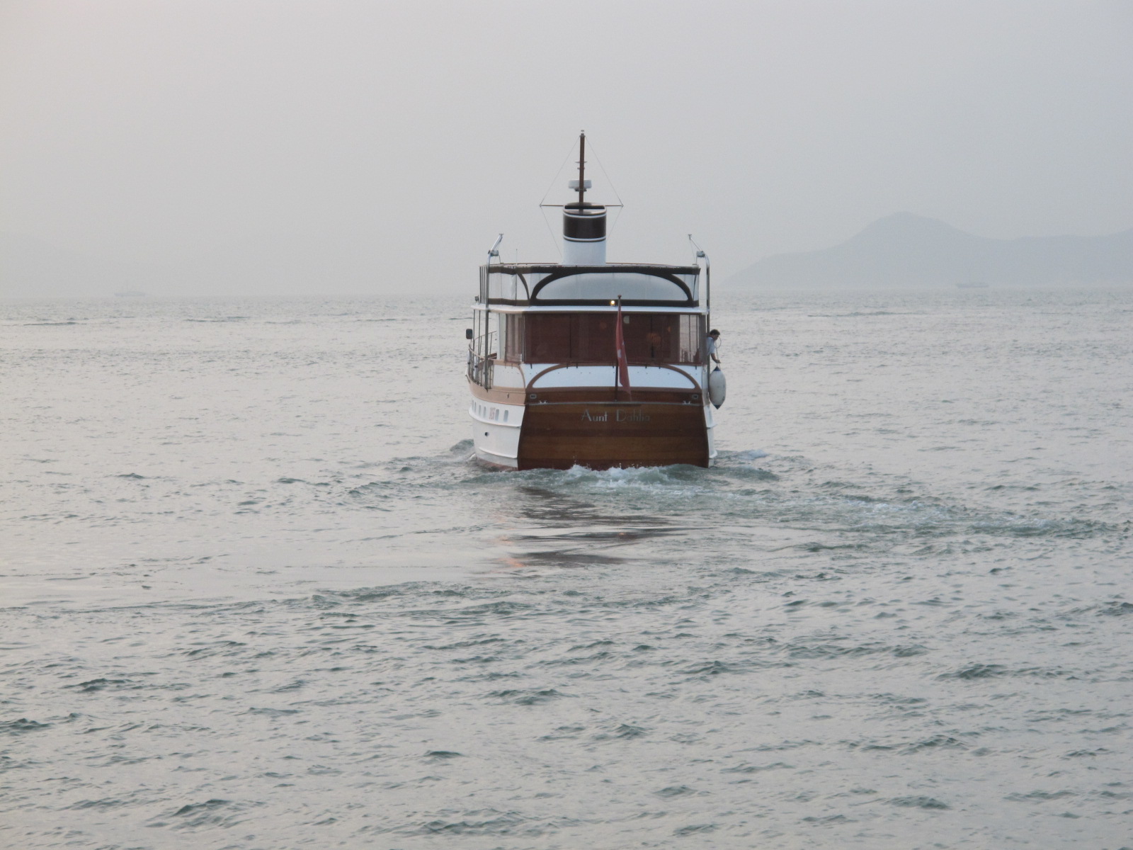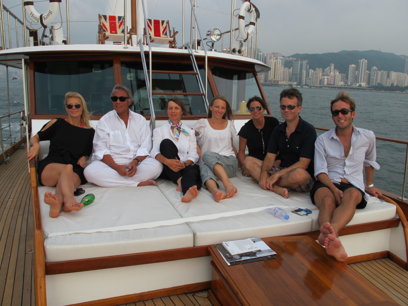 The meal complete, and a ceremonial cigar with David (how could my husband turn down a Cuban offered by their honorary ambassador?) we headed out to board their fancy “ocean-liner of old” style yacht.  We sat up on the top deck admiring Sai Kung, but one by one we peeled off for bathing suits. GP came out in a tiny pink bikini looking entirely glamorous.  I gulped hard and decided not to care and donned my own army green bikini.  Who’s looking at me anyway?!  We had just had a discussion of the dodgy water quality in HK and Mr.E’s mysterious viral water warts that his doctor had said probably came from swimming in the ocean.  So GP hesitated on the deck for an awkward several minutes after the rest of us had jumped in, probably doing a mental calculation of the risk and reward of a refreshing swim, making her singing debut at the CMA covered in water warts, and the commercially beneficial irony of actually catching a virus while filming the movie Contagion in which she is patient zero for a devastating virus that sweeps the world.